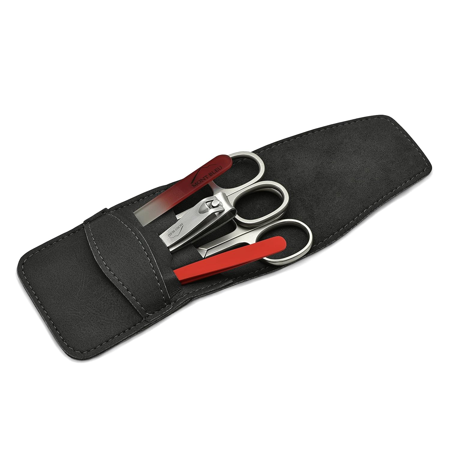 5-Piece Manicure Set made by Mont Bleu with crystal nail fileA good companion wherever you go. Mon Bleu manicure kits have a good reputation worldwide. These sets are functional and durable, at home or when traveling.Contents:Nail scissors - sharp and precise, suitable for finger or toe nails, Made of Nickel-plated Steel in ItalyCuticle scissors - pointed, narrow blades, suitable for removing cuticles or hangnails, Made of Nickel-plated Steel in ItalyNail clipper - for finger nails, Made of Stainless SteelTweezers - slant end will catch even the smallest hairs, Made of Stainless SteelCrystal nail file - handmade of tempered glass in Czech Republic, perfect for taking care of your nailsCase:Faux-leather (leatherette), cruelty free, vegan friednly, made in Germany Size ca. 110 x 55 mmGift idea:Manicure sets are ideal gifts for him and her, or to take on your trips and journeysMont Bleu:A manufacturer of crystal nail files has almost 15 years’ experience in keeping the quality bar on highest level of customer satisfaction. Mont Bleu manicure sets are a combination of latest technology and renowned craftsmanship.