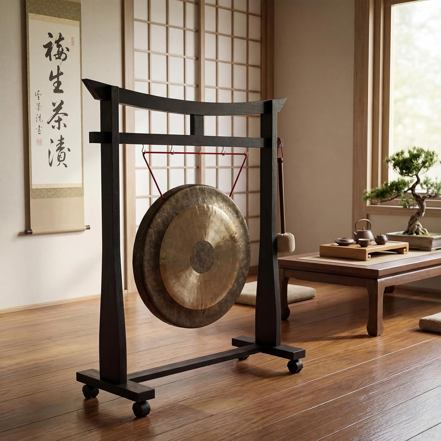 Features: The wooden structure of the gong stand can absorb excess vibration, reduce noise, and ensure pure and rich gong sound, which is better than metal or plastic materials. Wooden materials have natural textures, full of classical style, and combine practicality and artistic appreciation. Specifications: Material: main wood Color: black Size: 24.41 x 24 inches/62 x 60 cm without wheels Package includes: 1 x Gong stand with 2 wheels Notes: Manual measurement, please allow slight errors on size. The color may exist a slight difference due to different screen displays. Small parts included, please keep them away from little people to avoid swallowing risk